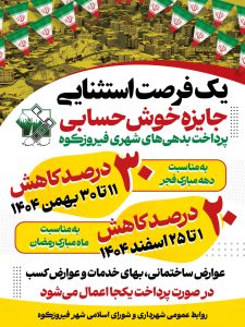 به گزارش روابط عمومی شهرداری و شورای اسلامی شهر فیروزکوه، با توجه به مصوبه شورای اسلامی شهر فیروزکوه و به استناد ماده ۵۹ قانون رفع موانع تولید و همزمان با فرا رسیدن دهه مبارک فجر و گرامیداشت یاد و خاطره شهدای والامقام شهر فیروزکوه، تسهیلات ویژه‌ای در پرداخت عوارض شهری اعمال می‌شود.