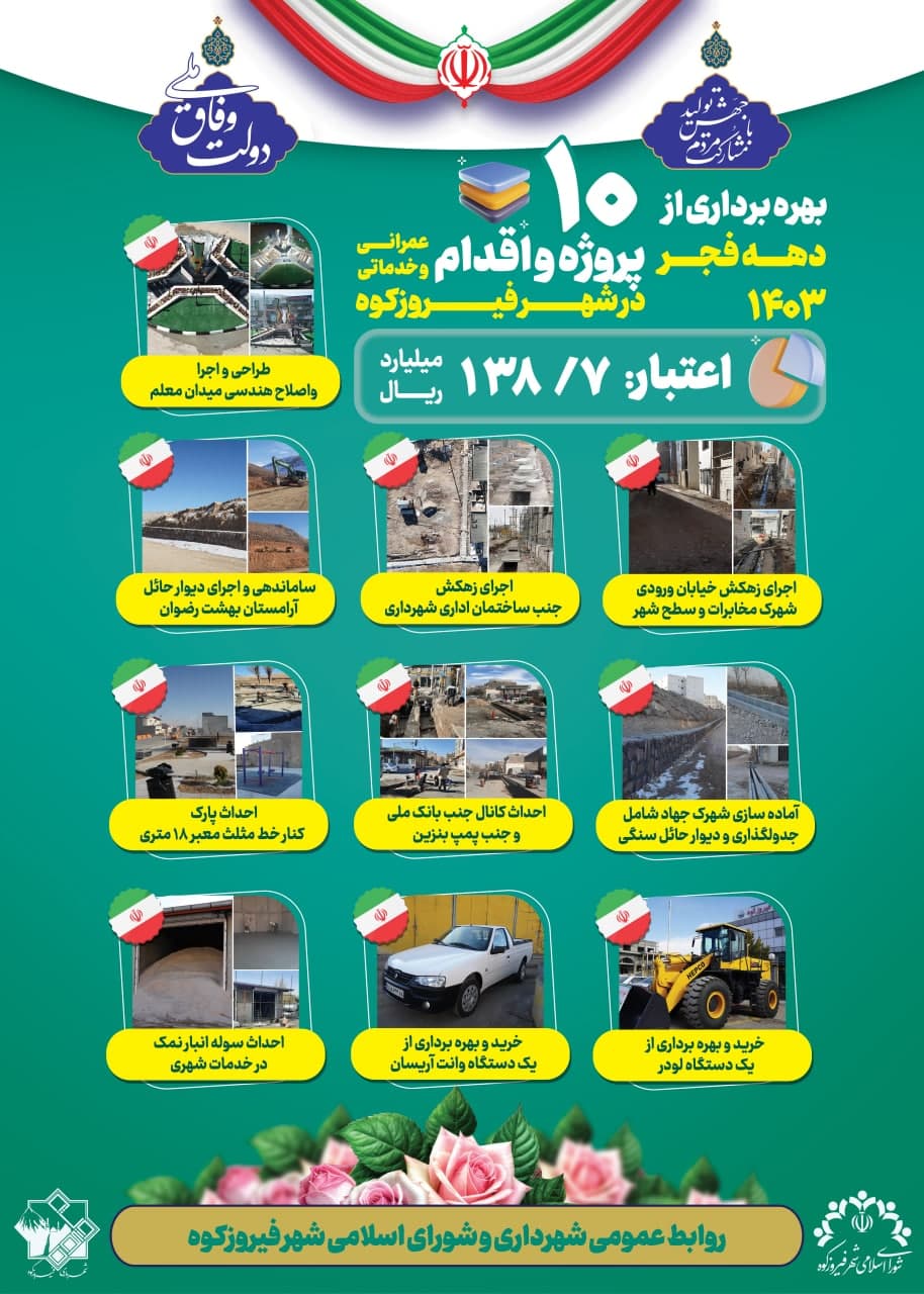 به گزارش روابط عمومی شهرداری و شورای اسلامی شهر فیروزکوه، شهردار فیروزکوه در گفتگو با خبرنگاران گفت: همزمان با ايام الله دهه مبارك فجر، 10 اقدام و پروژه عمرانی و خدماتی در اين شهر با اعتبار 138 ميليارد و 700 میلیون ريال به بهره برداری خواهد رسید.