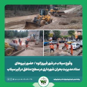 تاریخ خبر: 1404/4/23وقوع سیلاب در شهر فیروزکوه / حضور نیروهای ستاد مدیریت بحران شهرداری در سطح مناطق درگیر سیلاببه گزارش روابط عمومی شهرداری و شورای اسلامی شهر فیروزکوه، شهردار فیروزکوه گفت: در پی بارش شدید باران و وقوع سیلاب در فیروزکوه،…ادامه مطلب