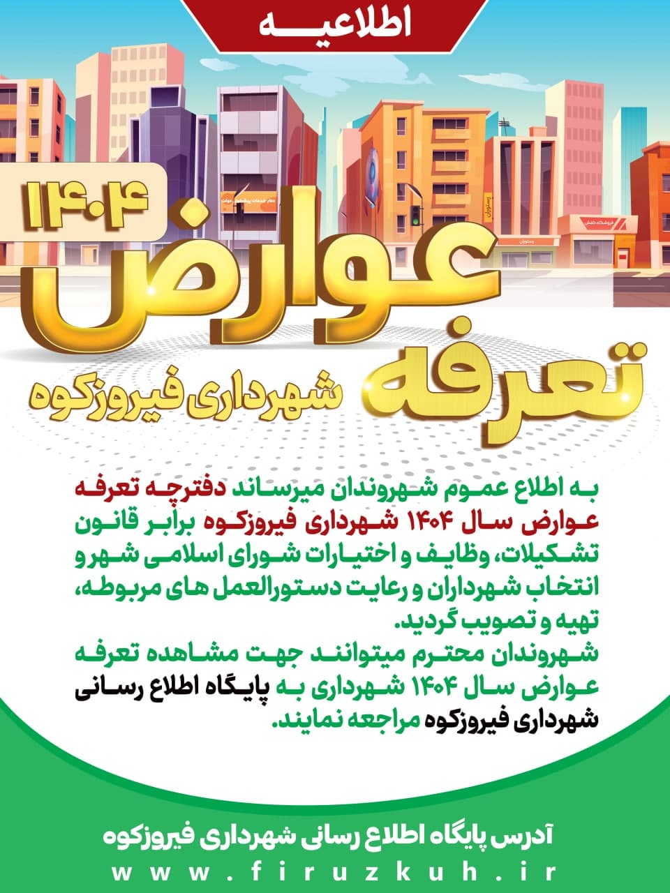 شهروندان محترم میتوانند جهت مشاهده تعرفه عوارض سال 1404 شهرداری فیروزکوه به آدرس سایت شهرداری به نشانی www.firuzkuh.ir مراجعه نمایند.